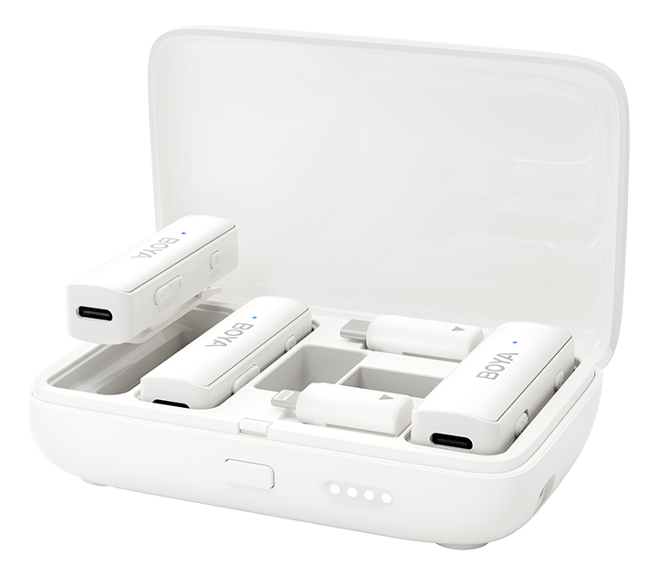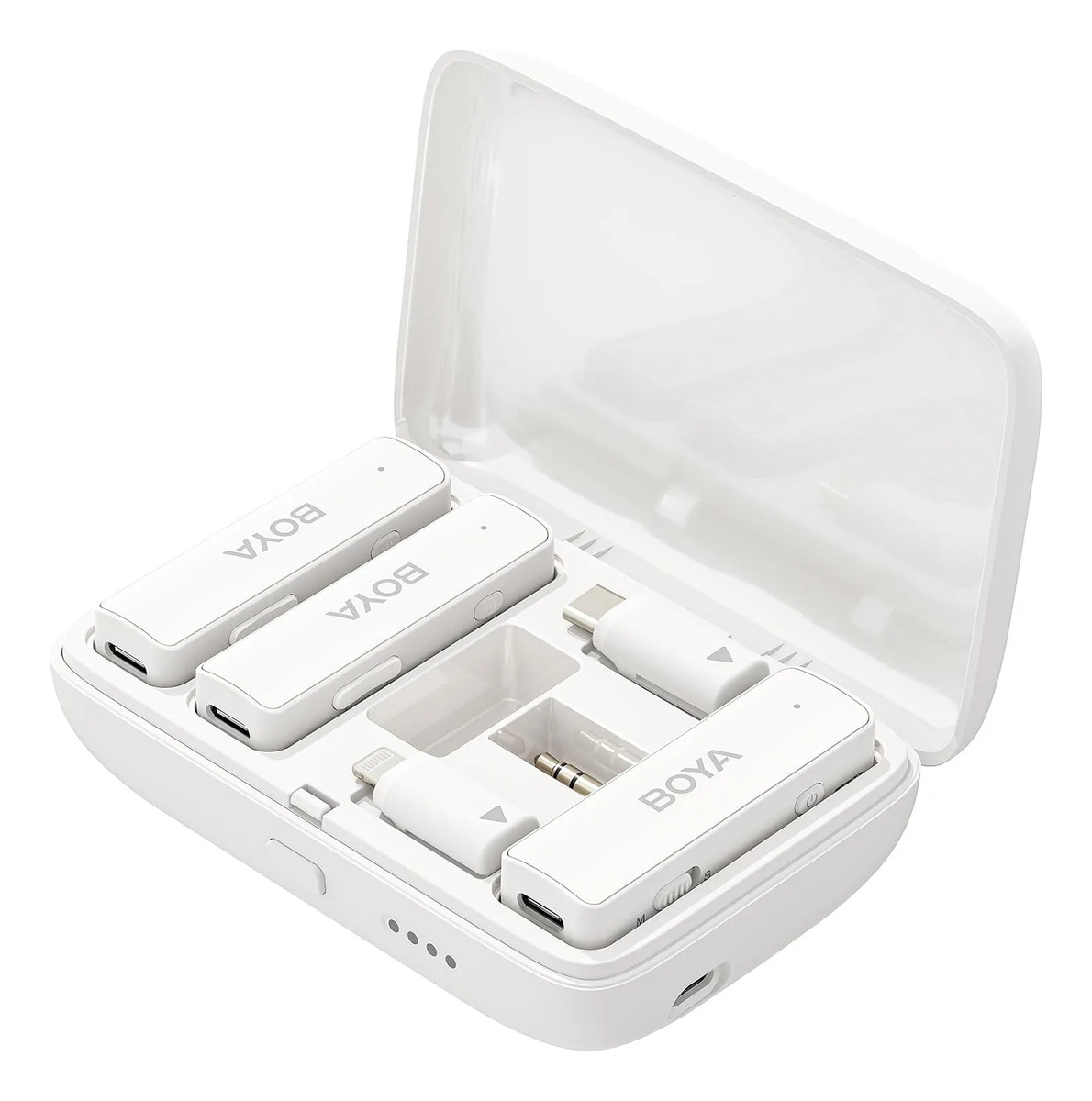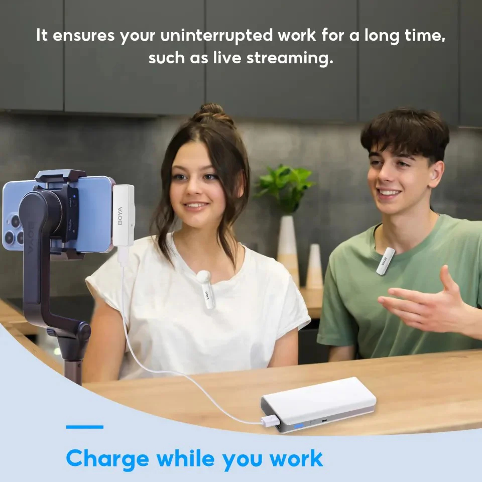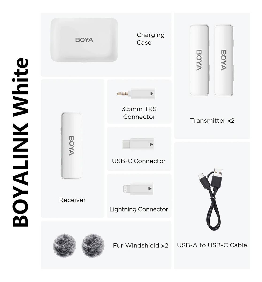 “Sistema de micrófono inalámbrico con conectores analógico mini plug TRS de 3,5 mm, USB-C y iOS Lightning