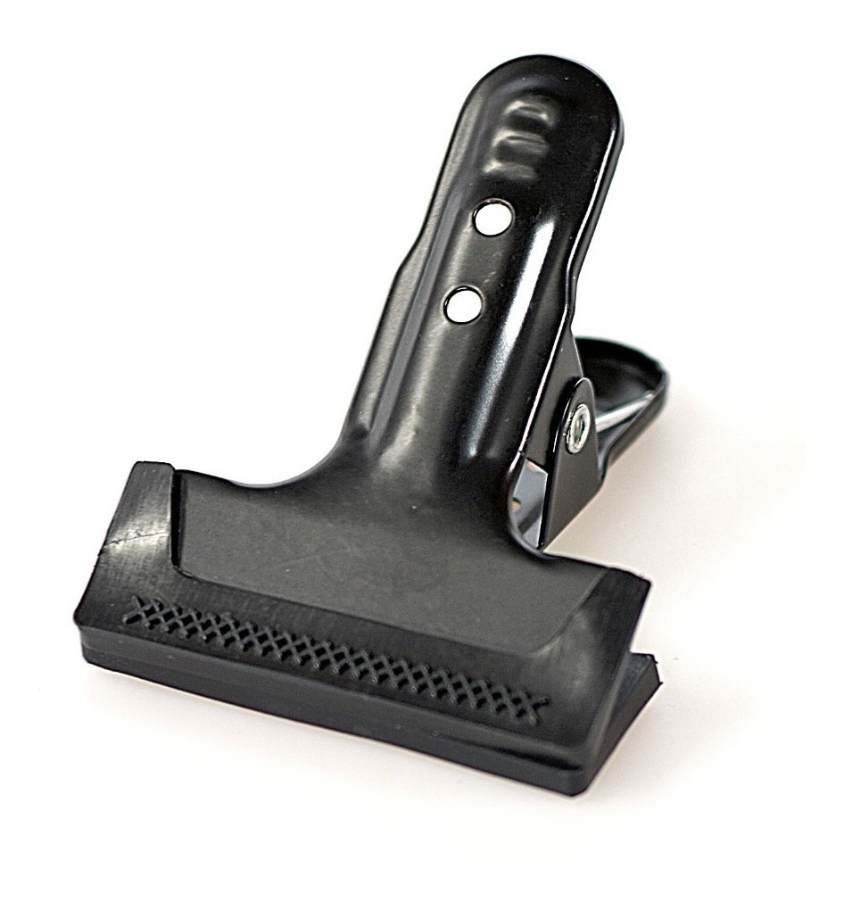 Pinza metálica con goma para evitar rayar la superficie que abrace.