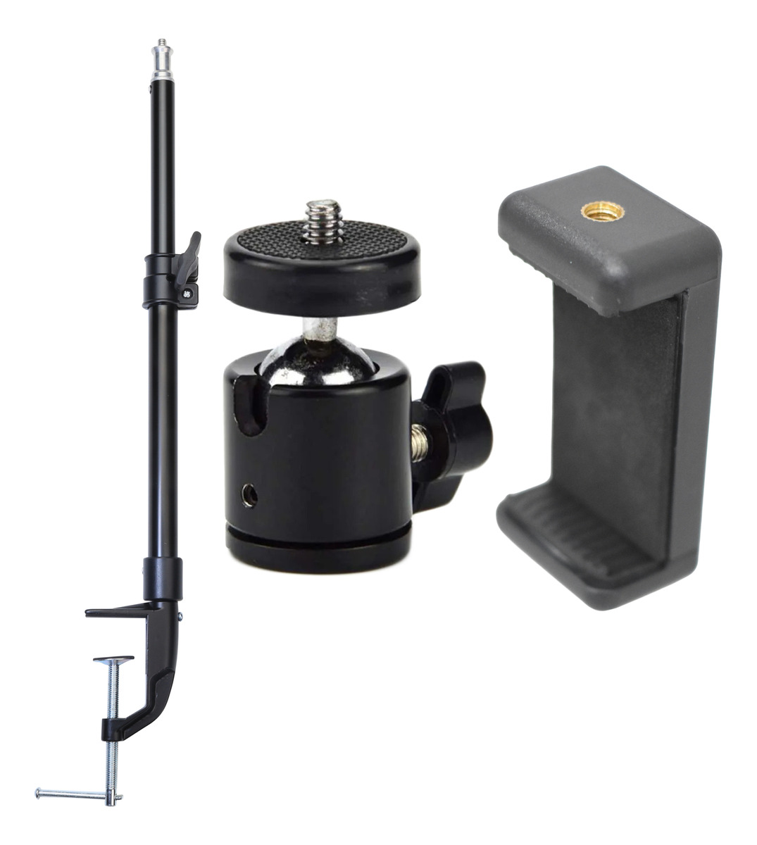 Soporte con abrazadera de montaje a mesa + Cabezal bola + Soporte para Smartphone