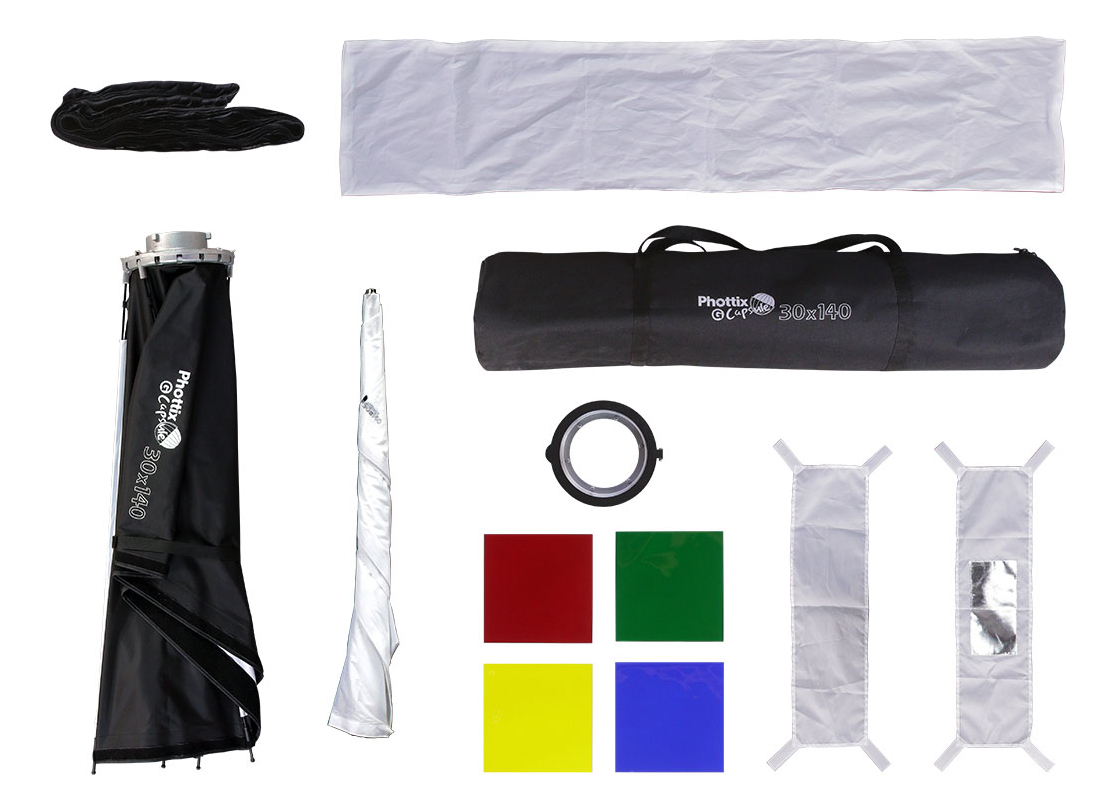 El sistema G-Capsule de Phottix es un softbox innovador que funciona como Strip softbox tradicional, sombrilla translúcida, efecto beauty dish o Lantern, incluye panal de abejas y soporte de filtros magnético con 4 colores.