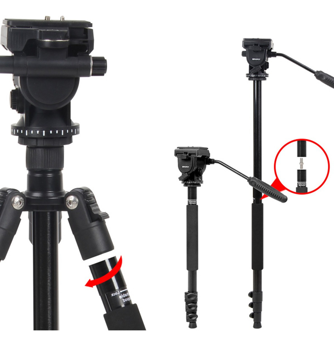 Su práctico y novedoso diseño permite desarmar una de las patas, enroscandola en la columna central transformándolo en un Monopie compacto con una altura máxima de 170cm